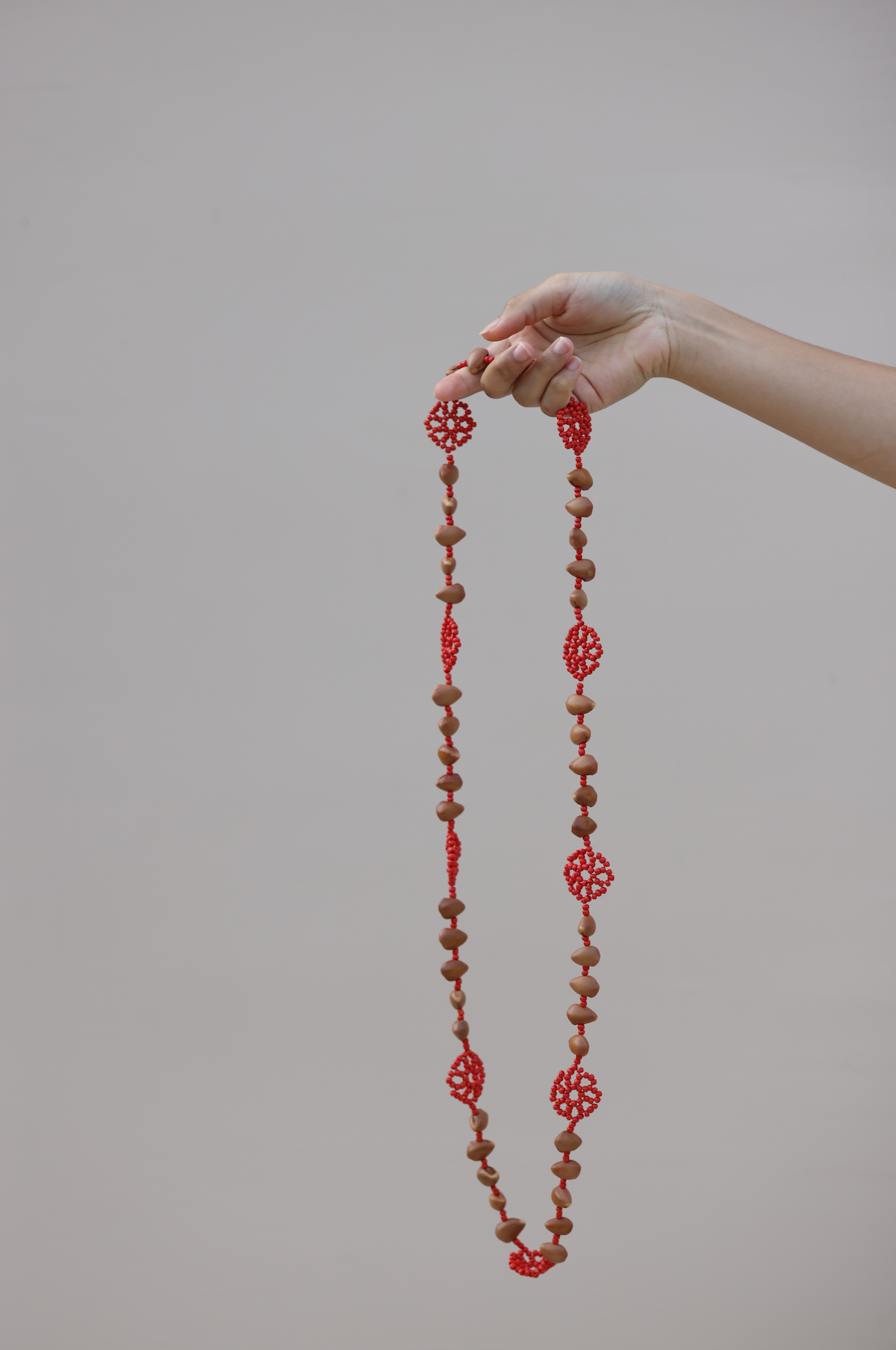 Tones of red beaded flower details with Wongai Seeds Necklace.