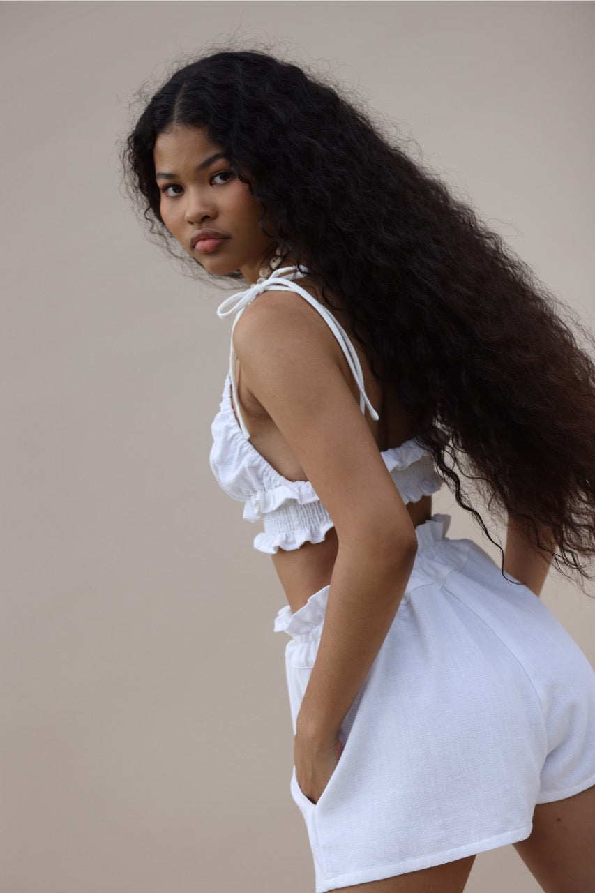 The North Ruffle Top is a playful, feminine silhouette perfect for breezy summer days. Adjustable fit hug your curves for easy, everyday style. Pair with the North Drawstring Shorts as a matching set that seamlessly transitions from beach to street and beyond.