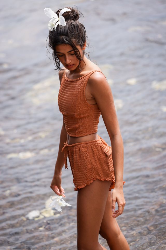 'Sunfall' textured smock knit, evoking the radiant red glow and the rich red dirt that graces every island.